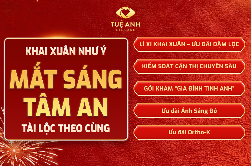 Khai xuân rạng rỡ, bảo vệ tầm nhìn cho cả gia đình! Nhằm đồng hành cùng quý khách hàng trong việc chăm sóc sức khỏe thị giác đầu năm, Phòng khám Mắt Tuệ Anh triển khai đại tiệc ưu đãi lớn nhất năm. Đây là cơ hội vàng để ba mẹ kiểm soát cận thị cho trẻ và cả nhà tầm soát bệnh lý mắt với chi phí cực kỳ hấp dẫn.
